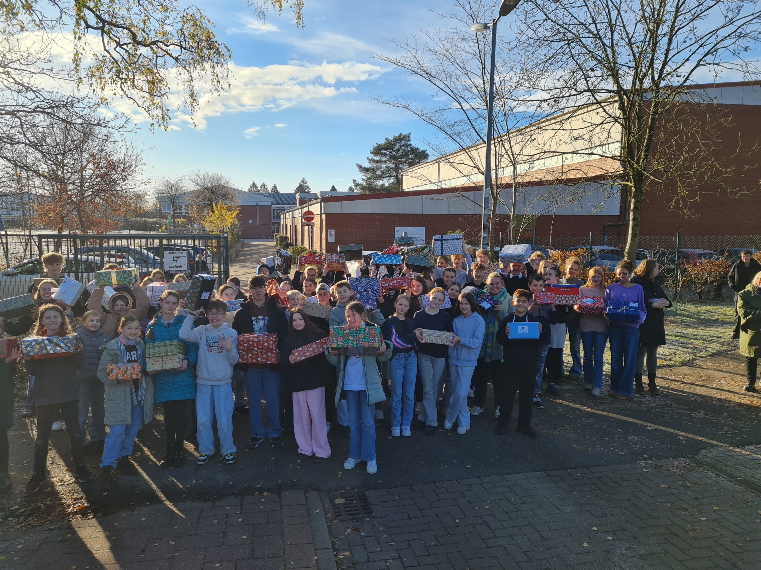 Am Freitag, den 21.11. um 10:20 Uhr hielt der Weihnachtspäckchenkonvoi an der Waldschule Schwanewede. Viele Schülerinnen und Schüler brachten ihre Päckchen zur Bushaltestelle, dort füllten die ingesamt 132 Weihnachtspäckchen drei PKWs.