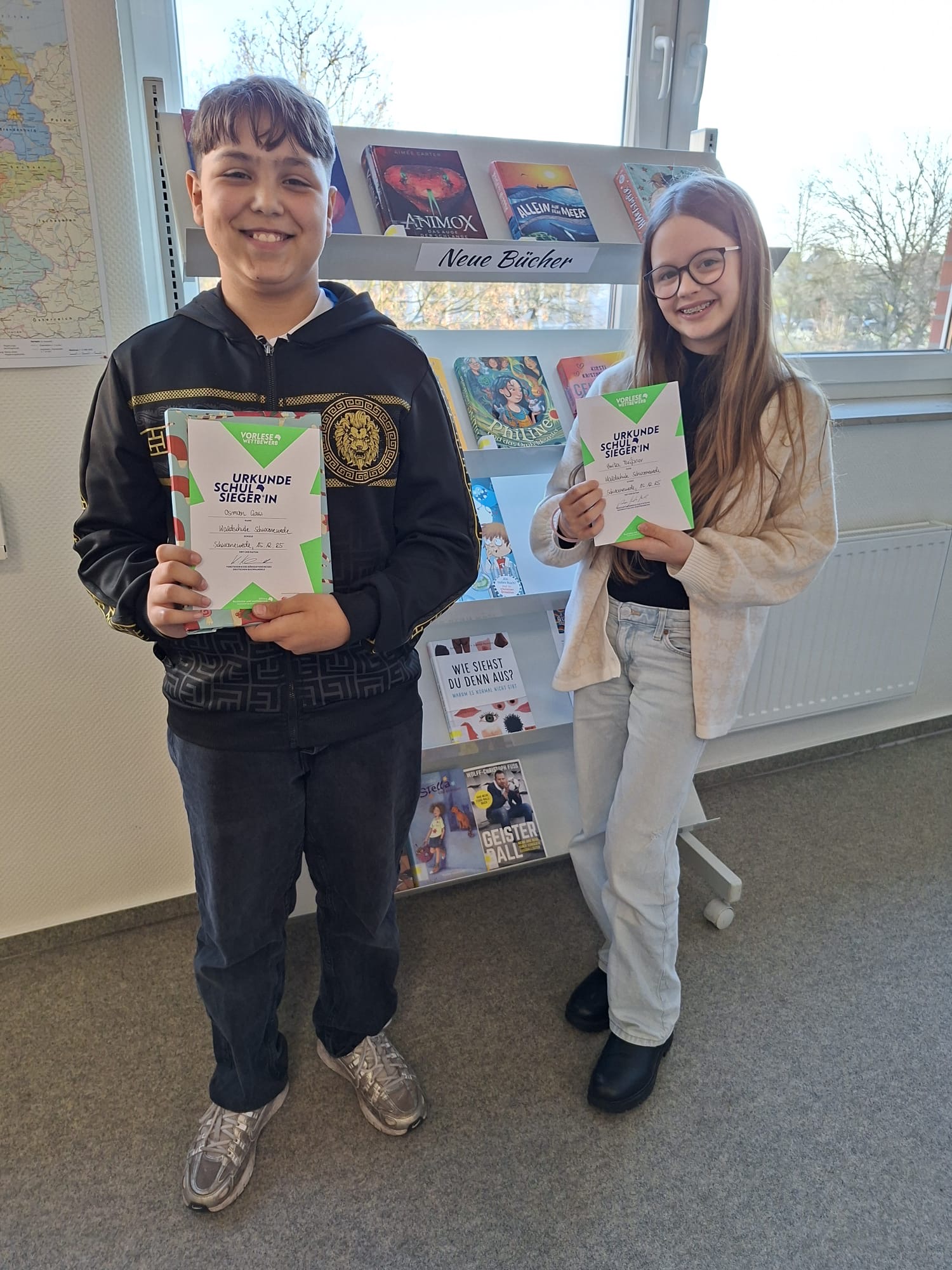 Am Ende konnten sich Emilia aus der 6A1 und Osman aus der 6B4 durchsetzen. Sie werden die Waldschule nun auf dem Kreisentscheid im Februar vertreten.