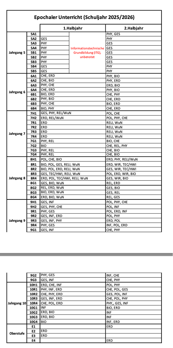 Im Epochalunterricht werden bestimmte Nebenfächer innerhalb eines Schuljahres nur für ein Halbjahr unterrichtet. Da der Unterricht an der Waldschule in Blöcken von jeweils 80 Minuten stattfindet, wird die vorgesehene Unterrichtszeit für diese Nebenfächer auf ein gesamtes Schuljahr gerechnet somit innerhalb eines Halbjahres erreicht. Vorteilhaft an dem Modell des Epochalunterrichtes ist, dass die Schülerinnen und Schüler sich konstant mit einem Fach und dessen Inhalten beschäftigen können. Ein stetiger Unterrichtsfachwechsel im Stundenplan wird somit unterbunden.